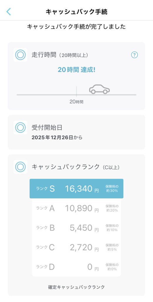 私の場合、58000円での契約だったためキャッシュバックを差し引くと約42000円で済んだことになります。安全運転は家計にも優しく、とてもありがたいです。
